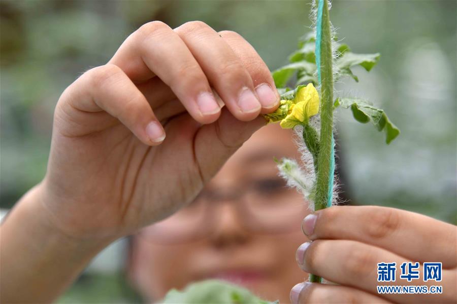7月16日,在潍坊市寒亭区郭牌农业种植示范园,工作人员在给西瓜授粉。 新华社记者 郭绪雷 摄