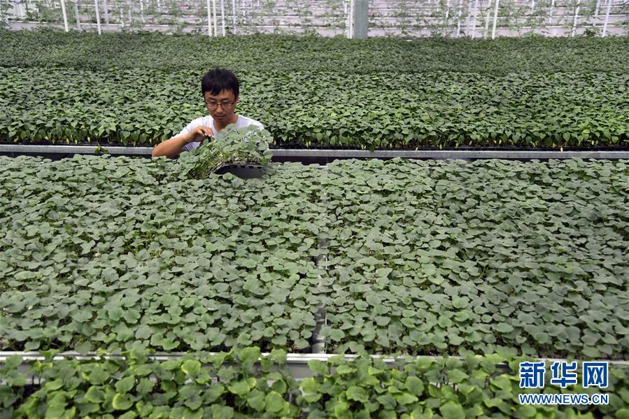 7月16日,在潍坊市寒亭区郭牌农业种植示范园,工作人员在查看育苗情况。 新华社记者 郭绪雷 摄