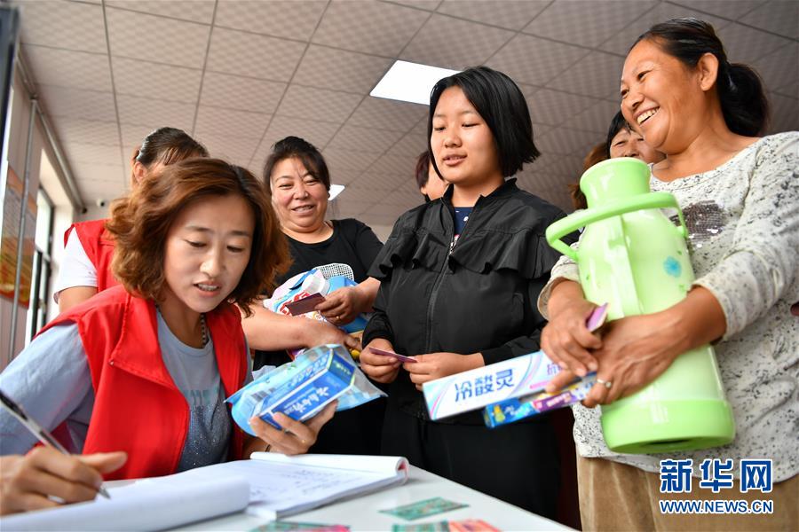 7月16日,大同云州区瓜园村村民在用“爱心积分卡”兑换商品。2019年上半年,瓜园村累计兑换近万分“爱心积分”,共有200余户村民受益。 2018年底起,山西大同云州区在下辖乡镇建立起了30个“爱心超市”,所售商品主要由对口帮扶单位、社会各界爱心人士及企业捐赠。云州区贫困户和生活困难的群众可通过在人居环境、发展脱贫产业、参加集体活动等方面的表现获得“爱心积分”,并在“爱心超市”兑换所需物品。 新华社记者 曹阳 摄