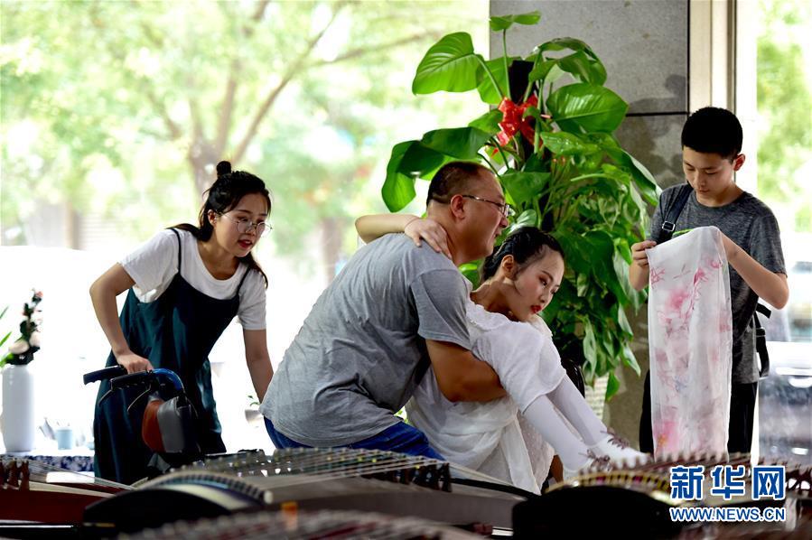 7月15日,演出结束后,王文卓回到培训学校继续她每天的练琴。王凯红从轮椅上将女儿(右二)抱起调整位置。 新华社发(刘亮亮摄)