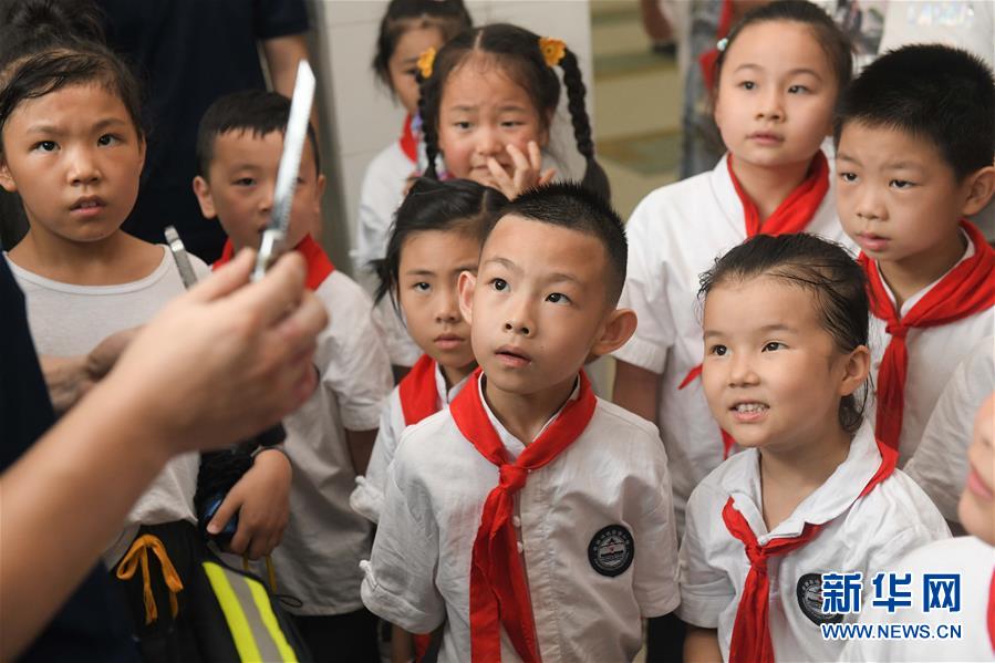 7月17日,小学生在了解消防救援工具。 当日,安徽省合肥市逍遥津小学组织学生及家长走进合肥市消防救援支队特勤大队一中队,通过学习消防知识,提高安全自救意识。 新华社记者 张端 摄
