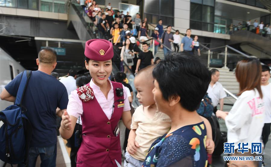7月17日,在福建福州火车站,G3001次福州至香港西九龙列车的乘务员在引导旅客有序上车。 暑运进入高峰,南铁福州客运段提前研判各线路旅客出行特点,针对旅游客流、学生客流、商务客流叠加的特点,组织培训、制定预案、强化乘务人员的服务意识,为旅客创造温馨的乘车环境。 新华社记者 宋为伟 摄
