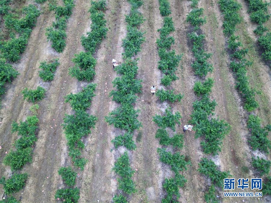 果农在石坝镇太平集村采摘水蜜桃(7月17日无人机拍摄)。 近年来,安徽省明光市石坝镇积极调整农业产业结构,采取“龙头企业+合作社+农户”的产业发展模式,发展以水蜜桃种植为特色的生态休闲农业,带动农民增收,助力乡村振兴。 新华社记者 刘军喜 摄