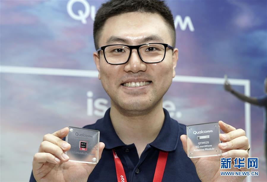 7月17日,在北京举行的2019年(暨第七届)IMT-2020(5G)峰会上,高通公司工作人员展示5G设备。 7月17日,由工业和信息化部指导,IMT-2020(5G)推进组联合中国通信标准化协会共同主办的2019年IMT-2020(5G)峰会在北京开幕,本次峰会以“5G商用 共赢未来”为主题,邀请工信部领导以及数十家国内外主流移动通信和行业应用单位专家500多人参加会议,集中探讨面向商用的5G标准、产业与应用等最新进展与发展趋势。 新华社记者 才扬 摄