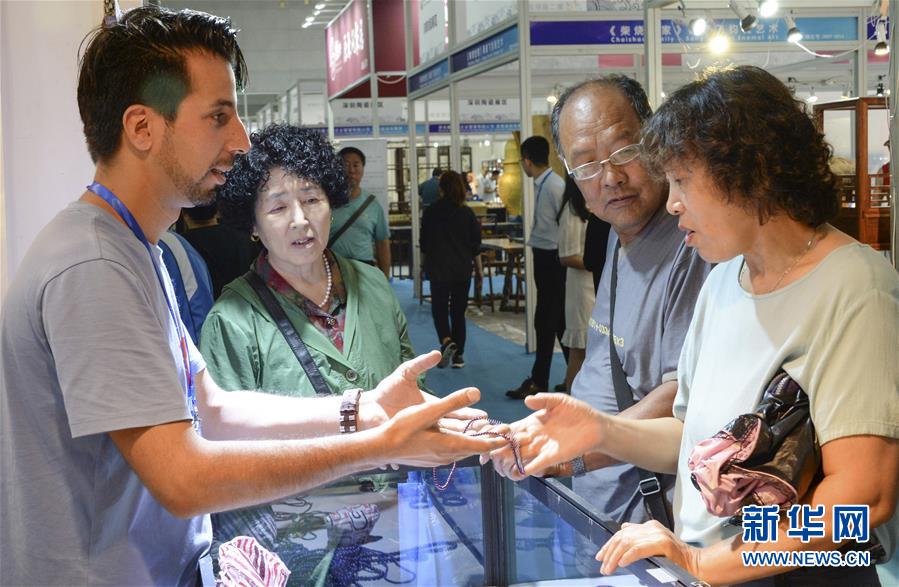7月17日,在第二届东北亚文化艺术博览会上,外国参展商向观众介绍展品。 当日,第二届东北亚文化艺术博览会在哈尔滨开幕。本届博览会分设文化产业综合馆和数字媒体生态馆两个展馆,设置包括国内展区、国际展区、数字文化展区、动漫游戏展区等在内的八大展区。 新华社发(谢剑飞摄)