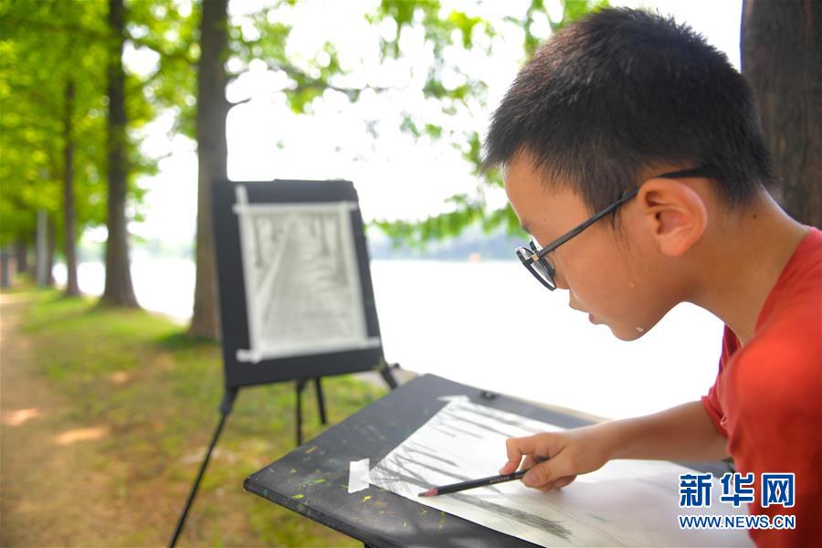 7月17日,小朋友在湖南烈士公园进行绘画创作。 当日,一些小学生在位于长沙市的湖南烈士公园进行户外写生训练,感受大自然之美,丰富暑假生活。 新华社发(陈泽国 摄)
