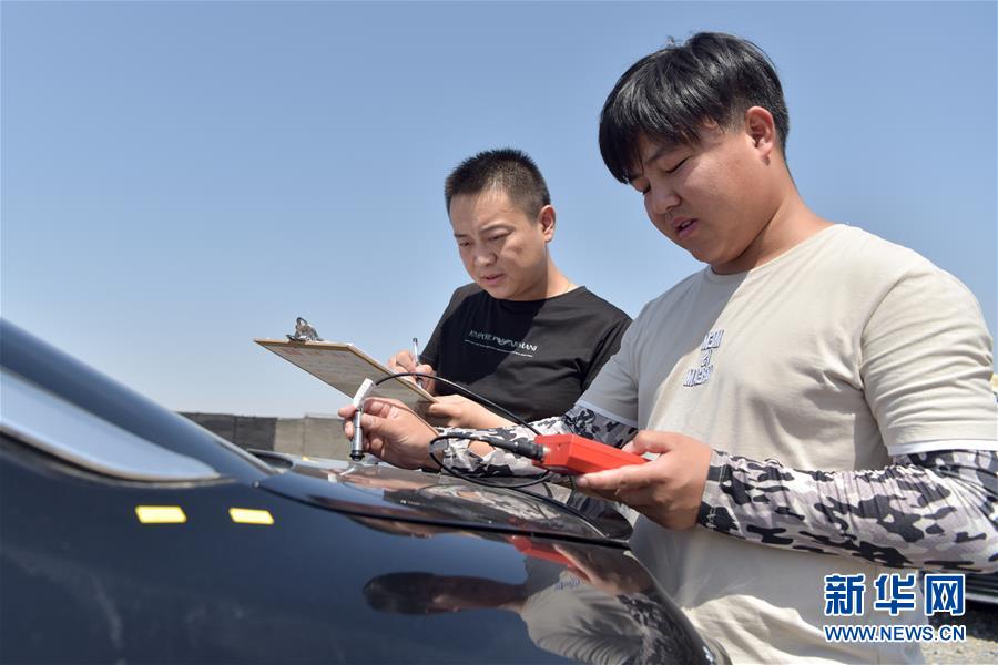 7月17日,在新疆吐鲁番自然环境试验研究中心,检测人员在整车静态区进行汽车漆膜厚度检测。 素有“火洲”之称的新疆吐鲁番市以极热、极干的气候,近年来吸引国内外众多车企、材料制造企业及科研院所纷至沓来,使这里成为国内汽车热区试验首选之地。 2018年,共有240余家国内外汽车企业、各类材料制造厂商及科研院所在吐鲁番进行热区试验。目前,在新疆吐鲁番自然环境试验研究中心,共有3万余件产品和零部件接受曝晒试验,200余件样品接受土壤腐蚀试验。 新华社记者 丁磊 摄
