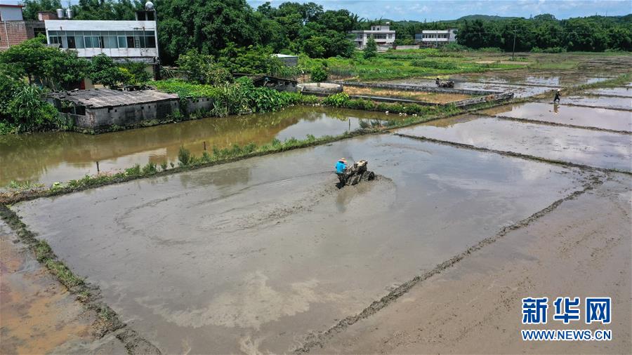 这是7月17日无人机拍摄的钦州市钦南区康熙岭镇横山村农民在翻耕秧田。 目前,南方正值早稻抢收、晚稻抢种的“双抢”农忙季节,广西钦州市积极组织农民开展“双抢”。 新华社记者 张爱林 摄