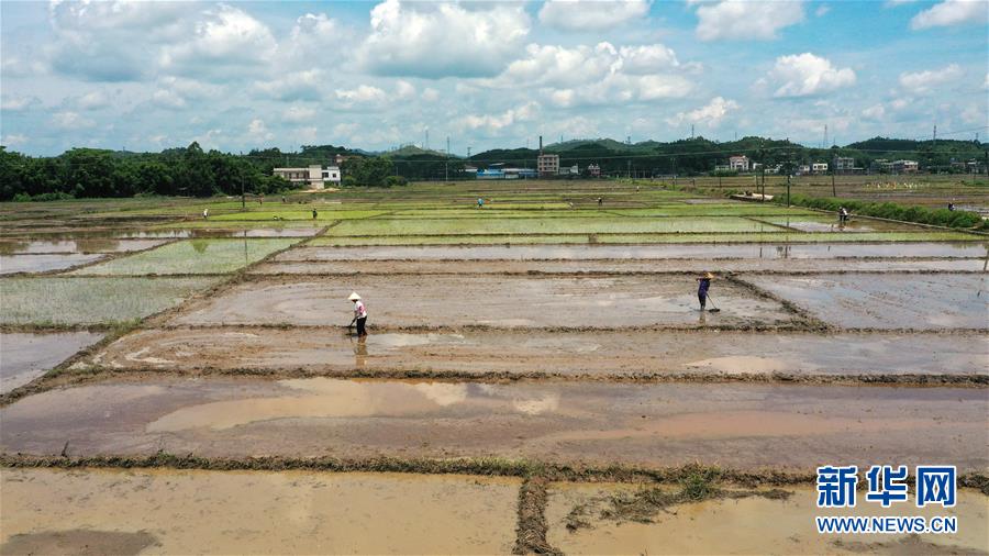 这是7月17日无人机拍摄的钦州市钦南区康熙岭镇横山村农民在田间耙田。 目前,南方正值早稻抢收、晚稻抢种的“双抢”农忙季节,广西钦州市积极组织农民开展“双抢”。 新华社记者 张爱林 摄