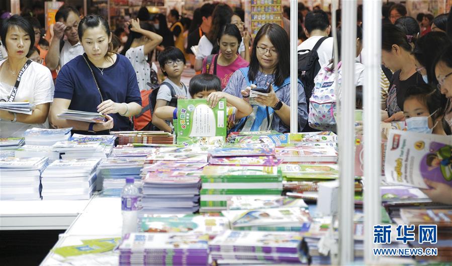 7月17日,家长和儿童在香港书展上选购图书。 当日,由香港贸易发展局主办的第三十届香港书展在香港会展中心开幕。今年书展主题聚焦科幻及推理文学,39个国家和地区的686家参展商云集于此,打破历年纪录。 新华社记者 王申 摄