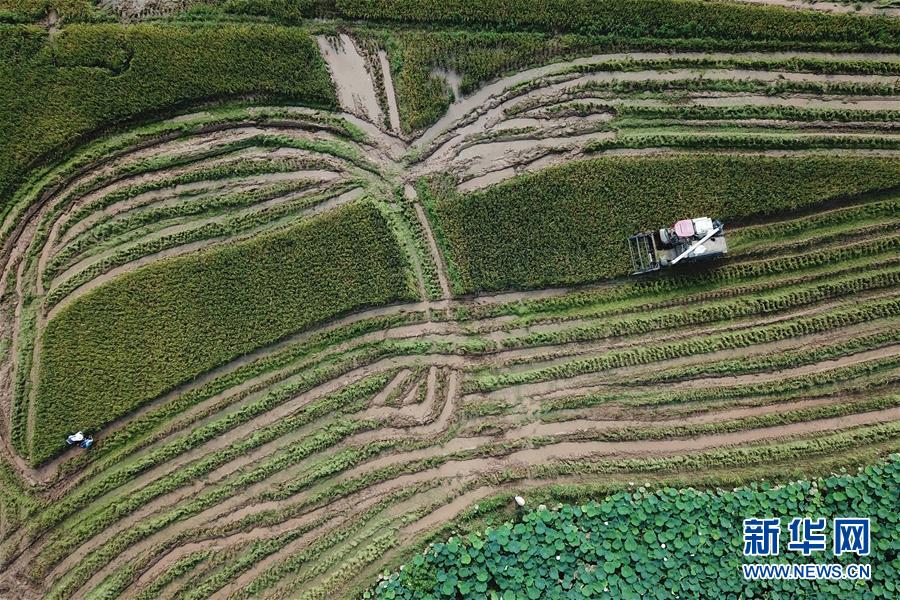 7月17日,湖南省衡阳市衡阳县西渡镇梅花村村民在抢收早稻(无人机拍摄)。 日前,受连续强降雨影响,湖南省衡阳县部分农田受淹。眼下天气好转,洪水退去,当地农民忙着抢收早稻、抢插晚稻,恢复生产。 新华社发(刘振军 摄)