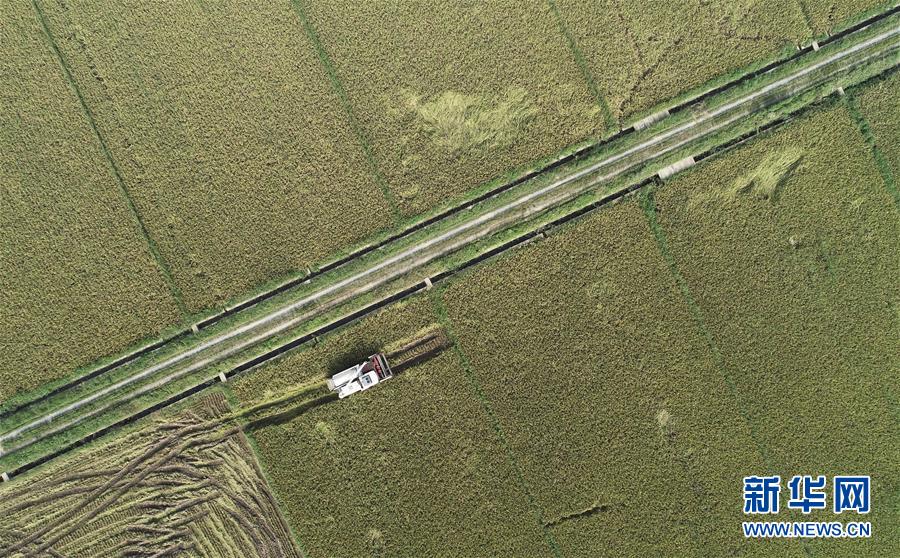 7月17日,湖南省衡阳市衡阳县西渡镇梅花村村民在收割早稻(无人机拍摄)。 日前,受连续强降雨影响,湖南省衡阳县部分农田受淹。眼下天气好转,洪水退去,当地农民忙着抢收早稻、抢插晚稻,恢复生产。 新华社发(欧红宇 摄)