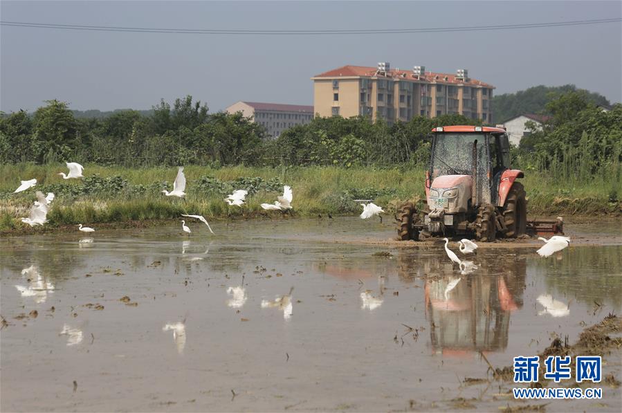 7月17日,湖南省衡阳市衡阳县西渡镇梅花村村民在平整刚抢收完的稻田。新华社发(潘爱民 摄)