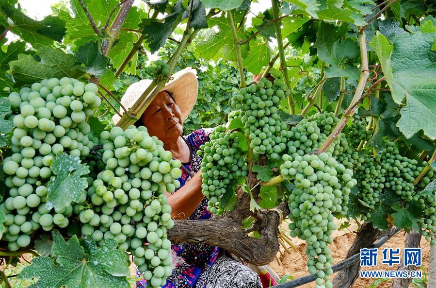 7月17日,在卢龙县卢龙镇一家酿酒葡萄种植基地,工人在进行葡萄管理。 近年来,河北省卢龙县因地制宜,大力发展林果产业,鼓励土地流转、引进龙头企业,种植苹果、葡萄、李子等果品,全县林果面积约15.6万亩,形成了“全年有果、四季飘香”的局面。 新华社记者杨世尧摄