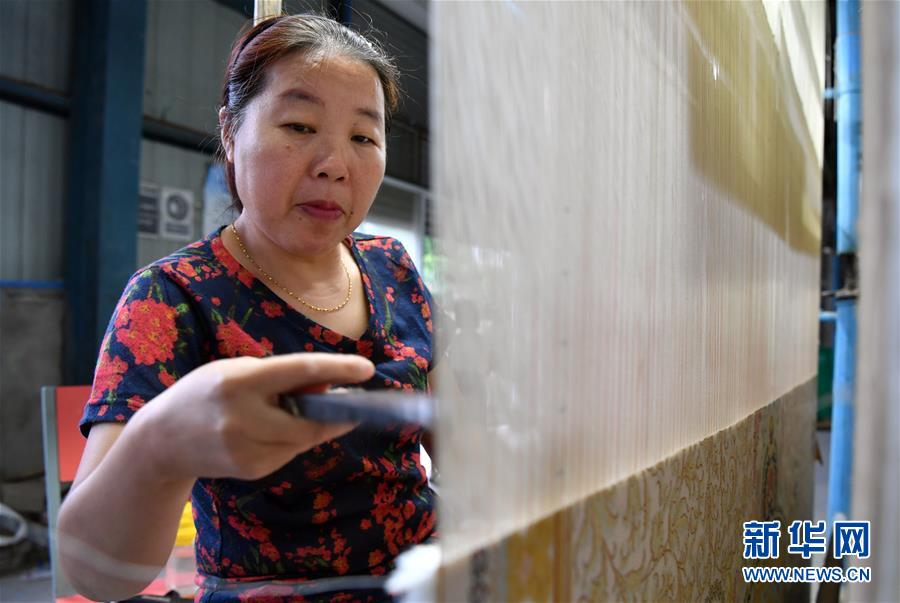 河南盛明实业有限公司的员工在车间编织真丝地毯(7月17日摄)。新华社记者 李嘉南 摄