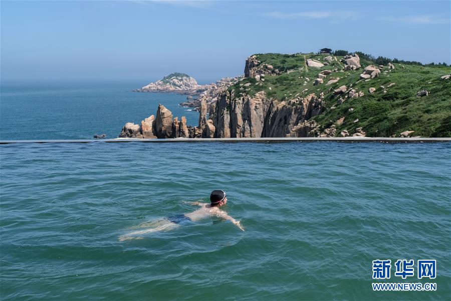 7月17日,游客在南麂岛上一家特色民宿前的泳池内游泳。 新华社记者 徐昱 摄