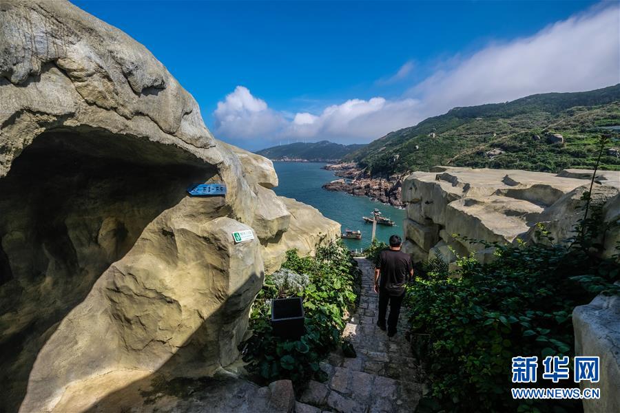 7月17日,游客经过南麂岛一家悬崖民宿酒店。 新华社记者 徐昱 摄