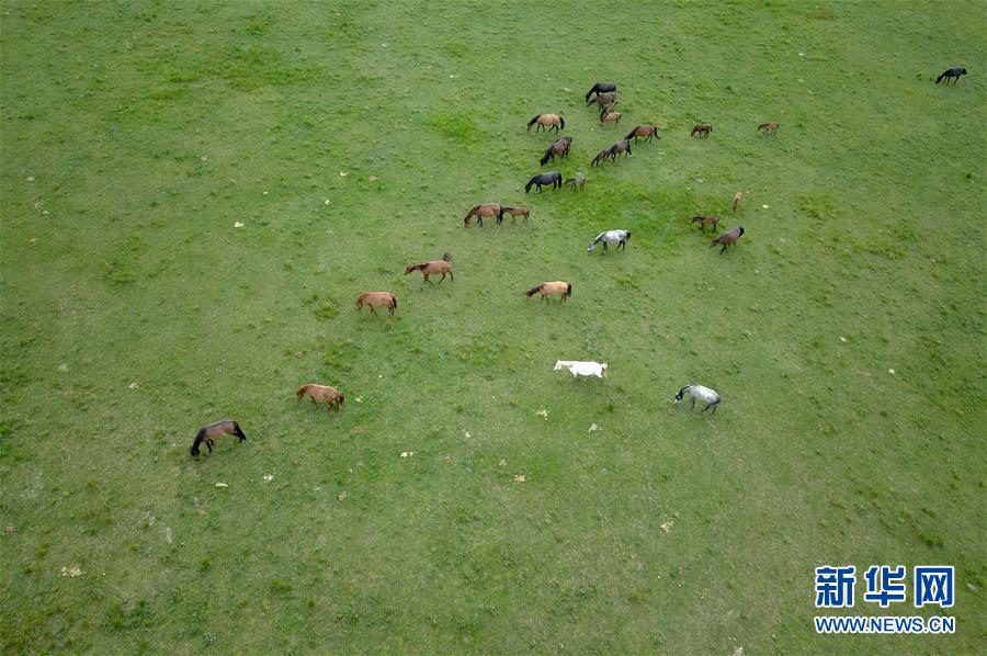 这是7月17日无人机拍摄的山丹马场上的马群。 盛夏七月,位于甘肃省河西走廊中部、祁连山北麓的山丹马场绿草如茵,成群的骏马在马圈和草原休息吃草,十分壮观。据介绍,山丹马场从西汉时期就开始养马,至今已有2000多年的历史。 新华社记者 范培珅 摄