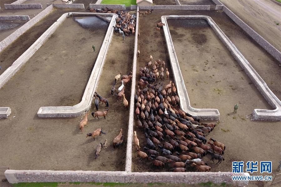 在山丹马场,马群在马圈内休息(7月17日无人机拍摄)。 盛夏七月,位于甘肃省河西走廊中部、祁连山北麓的山丹马场绿草如茵,成群的骏马在马圈和草原休息吃草,十分壮观。据介绍,山丹马场从西汉时期就开始养马,至今已有2000多年的历史。 新华社记者 范培珅 摄