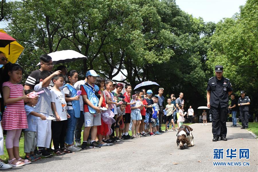 7月18日,警犬在表演血迹搜索。 当日,湖南省公安厅在警犬基地举行“警营开放日”活动,邀请放假的孩子们进警营参观、学习。民警为孩子们展示了警犬服从、追踪、车辆搜爆、箱包搜毒、血迹搜索等基础课目。 新华社记者 薛宇舸 摄