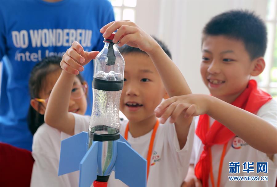 7月18日,在中福会少年宫举行的示范展示活动中,上海闵行区浦锦街道暑托班的孩子在志愿者的指导下,进行科技小制作“水火箭”。 当日,中国福利会少年宫举行科技趣味活动现场示范展示。据介绍,这些活动视频将送达上海的500多个“爱心暑托班”教学点,让更多孩子在暑假体验科技的趣味与魅力。 新华社记者 刘颖 摄