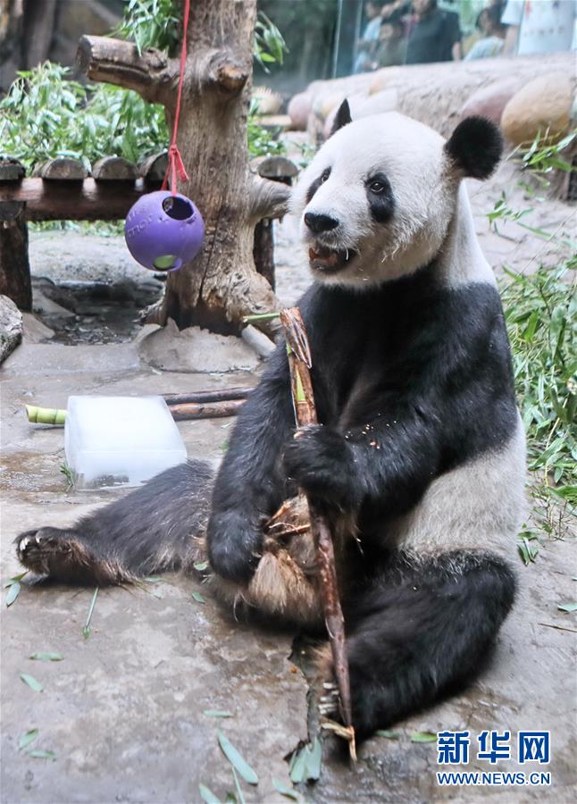 7月18日,在北京动物园,熊猫古古在空调屋内的冰块旁吃竹子。新华社记者 李欣 摄