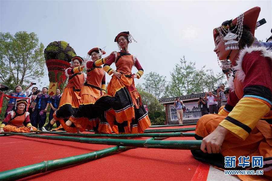 7月18日,演员在北京世园会广西园前表演竹竿舞。 新华社记者 鞠焕宗 摄