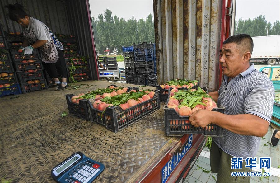 7月18日,桃农在永清县后奕镇石各庄村把采摘的鲜桃装车。 新华社记者 李晓果 摄
