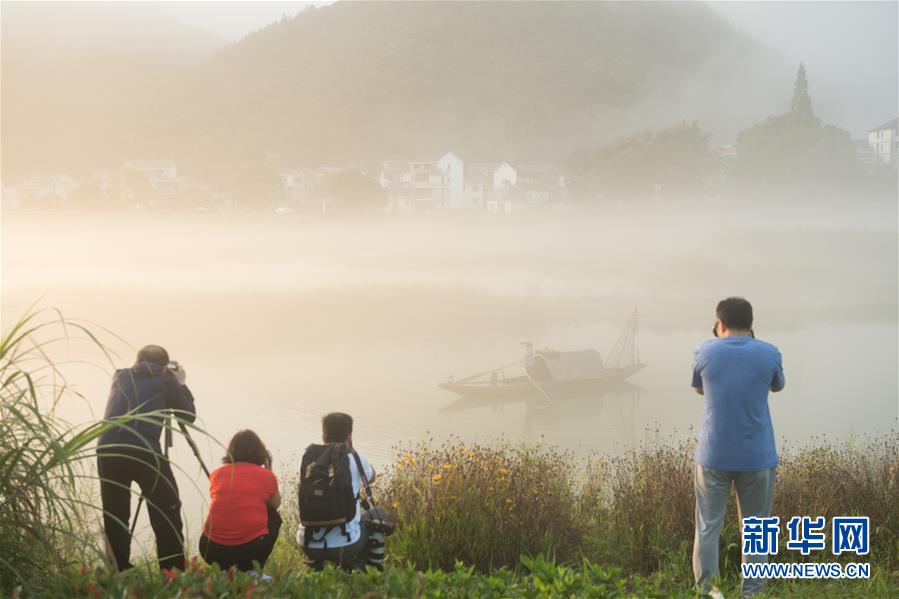 7月18日,摄影爱好者在下涯镇之江村拍摄渔模邵竹莲的情景表演。 新华社记者 翁忻旸 摄