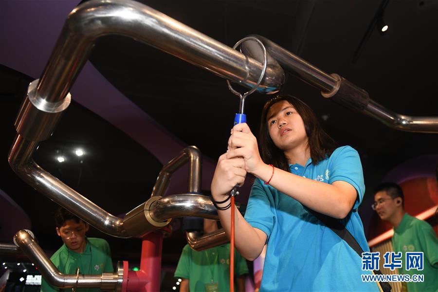 7月18日,广西柳州市第二中学学生黄馨楠(前)在合肥市科技馆体验科普项目。新华社记者 张端 摄