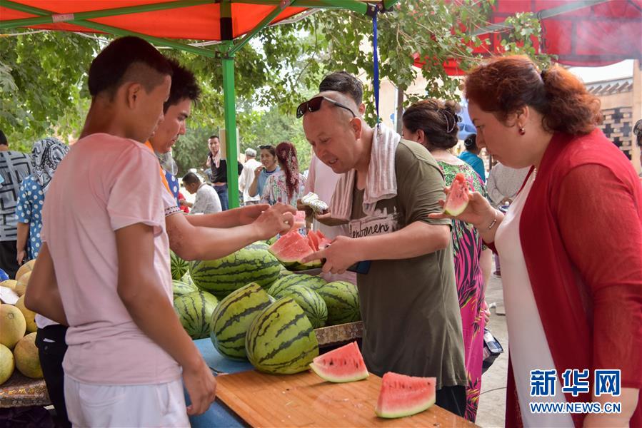 7月18日,游客在吐鲁番市“沙疗小镇”购买西瓜。新华社记者 丁磊 摄