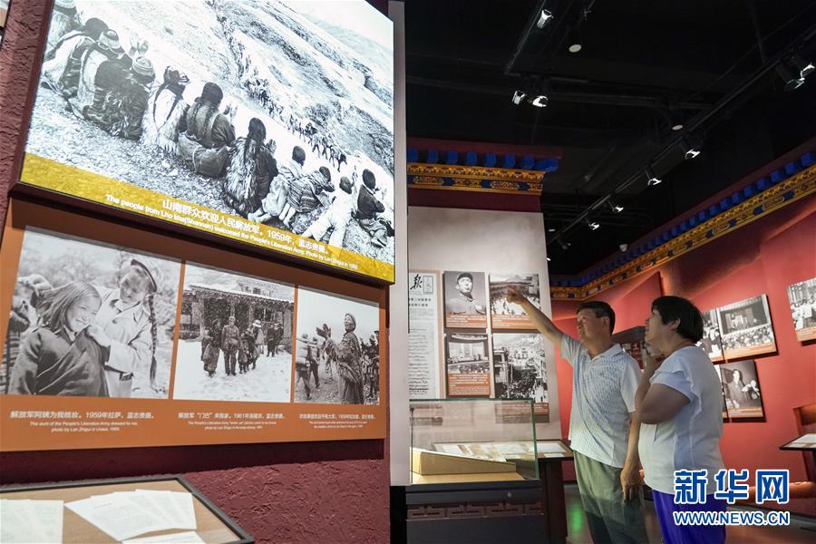 7月18日,参观者在“废奴丰碑——西藏民主改革60周年特展”上观看照片。 目前,“废奴丰碑——西藏民主改革60周年特展”在北京西藏文化博物馆举行,吸引不少观众前往参观。 该展览由中国西藏文化保护与发展协会、中国藏学研究中心和西藏自治区党委宣传部共同主办,免费向社会开放,将持续至12月底。 新华社记者 沈伯韩 摄