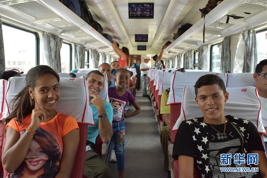 2019年7月13日,在古巴首都哈瓦那,乘客们坐在一列由中国设计并生产的铁路客车组成的列车上。新华社记者 朱婉君 摄