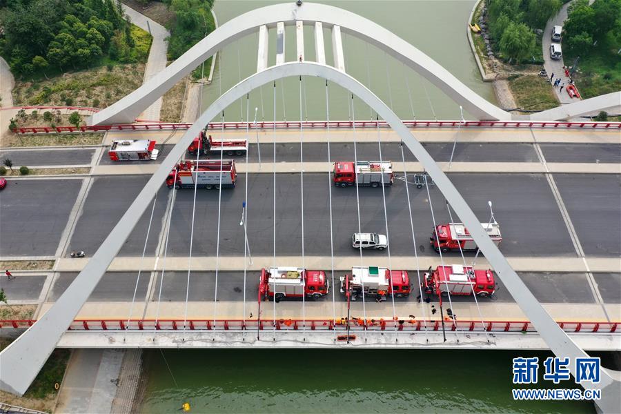 7月19日,抢险救援车辆在综合演练中集结(无人机拍摄)。 新华社记者李嘉南摄