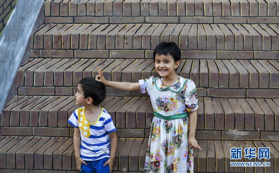 两名小朋友在新疆喀什古城景区阿图什巷3D画前玩耍(7月8日摄)。新华社记者 赵戈 摄