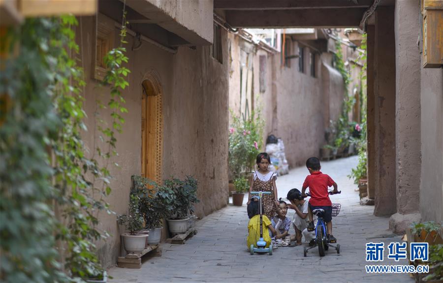 一群小朋友在新疆喀什古城景区里的一条小巷里玩耍(7月6日摄)。新华社记者 赵戈 摄