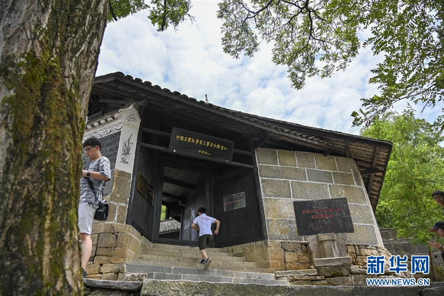 7月17日,在南腰界镇中国工农红军第三军司令部旧址前,游客在游览。 新华社记者 刘潺 摄