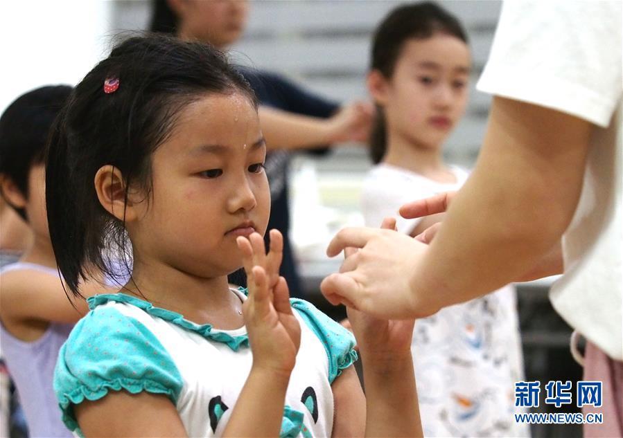 7月19日晚,老师在纠正小学员的手势。 当晚,在上海市徐汇区凌云街道社区文化活动中心的一间教室里,十几个娃娃跟着老师学习越剧表演的台步和手势。 据了解,每周五的晚上,上海如意越剧团的演员都会在这里教孩子们学习越剧表演的基本功,亲身体验传统戏曲艺术的魅力。 新华社记者 任珑 摄