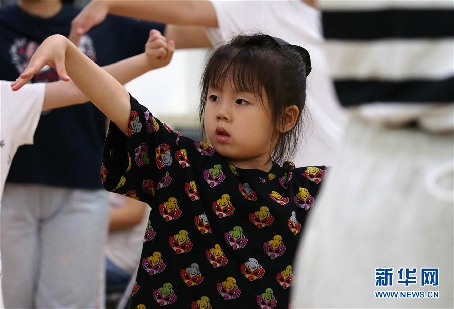 7月19日晚,7岁的翟依晨跟着老师学习表演身段。 当晚,在上海市徐汇区凌云街道社区文化活动中心的一间教室里,十几个娃娃跟着老师学习越剧表演的台步和手势。 据了解,每周五的晚上,上海如意越剧团的演员都会在这里教孩子们学习越剧表演的基本功,亲身体验传统戏曲艺术的魅力。 新华社记者 任珑 摄