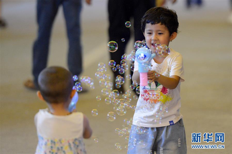 小朋友在吐鲁番市长沙·葡萄主题公园夜市玩耍(7月16日摄)。 盛夏时节,新疆迎来旅游旺季,各地的夜市也热闹起来。每到傍晚,位于新疆吐鲁番市的长沙·葡萄主题公园夜市成为许多市民和游客休闲、纳凉的好去处。人们穿行在一个个摊位之间,品尝新疆特色美食,选购丰富的商品,一派繁华喧闹景象。 新华社记者 丁磊 摄