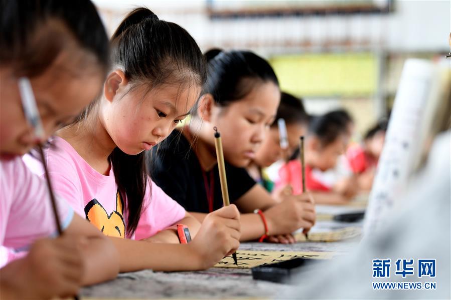 7月20日,肥西县紫蓬镇中心学校学生在练习书法。 暑假期间,安徽省肥西县紫蓬镇中心学校开办暑期少年宫,免费开设书法、葫芦丝、绘画、足球等特色兴趣班,丰富乡村儿童的暑期生活。 新华社记者 刘军喜 摄