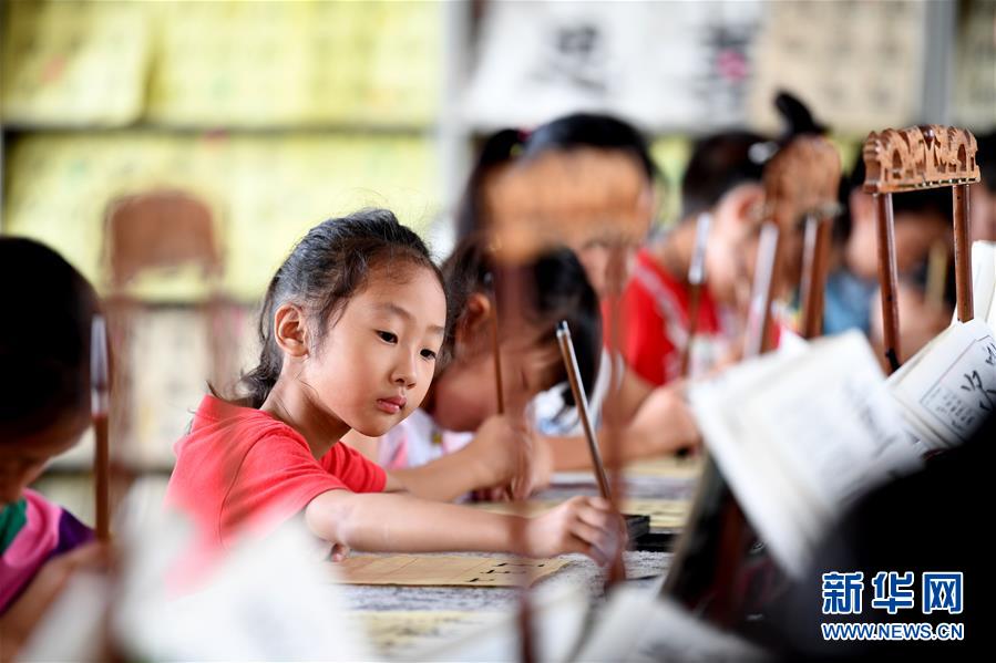 7月20日,肥西县紫蓬镇中心学校学生在练习书法。 暑假期间,安徽省肥西县紫蓬镇中心学校开办暑期少年宫,免费开设书法、葫芦丝、绘画、足球等特色兴趣班,丰富乡村儿童的暑期生活。 新华社记者 刘军喜 摄