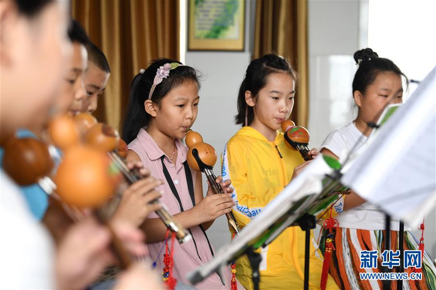 7月20日,肥西县紫蓬镇中心学校学生在学习吹奏葫芦丝。 暑假期间,安徽省肥西县紫蓬镇中心学校开办暑期少年宫,免费开设书法、葫芦丝、绘画、足球等特色兴趣班,丰富乡村儿童的暑期生活。 新华社记者 刘军喜 摄