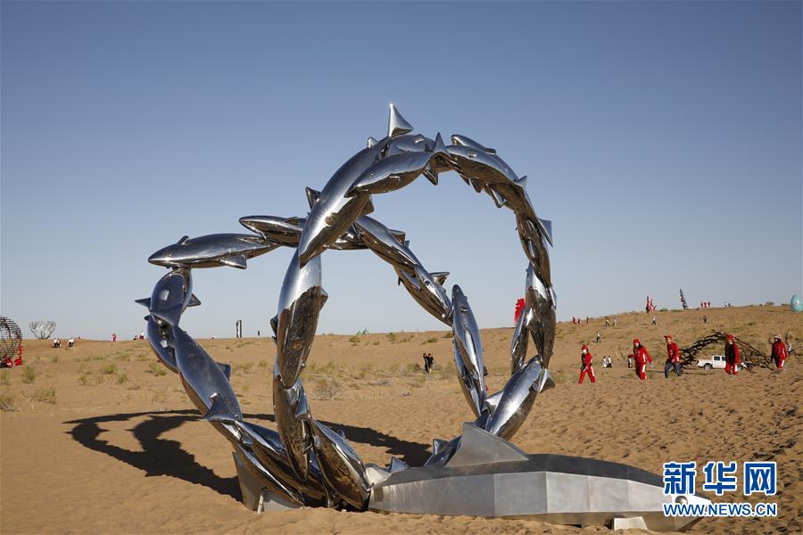 这是雕塑作品《民勤之爱》(7月20日摄)。 7月20日,2019中国·民勤第二届沙漠雕塑国际创作营在甘肃省武威市民勤县苏武沙漠大景区开幕,来自20个国家和地区的艺术家创作的46件雕塑作品亮相。 新华社发(张智敏 摄)