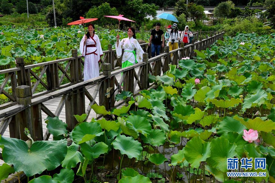 7月21日,游客在武夷山市五夫镇万亩荷田游览。 当日,福建省武夷山市五夫镇举办一年一度的荷花节。近年来,五夫镇大力发展荷花经济,有效推动了乡村产业振兴。 新华社记者张国俊摄