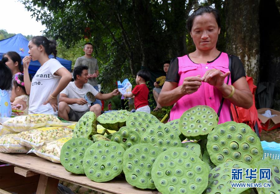 7月21日,武夷山市五夫镇农民在荷花节上销售莲蓬。 当日,福建省武夷山市五夫镇举办一年一度的荷花节。近年来,五夫镇大力发展荷花经济,有效推动了乡村产业振兴。 新华社记者张国俊摄