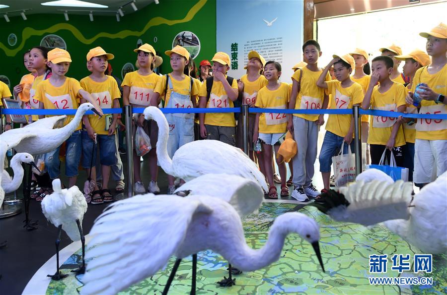 7月21日,暑期爱心托管班的孩子们参观白塔湖国家湿地公园科普宣教馆。 新华社记者 韩传号 摄