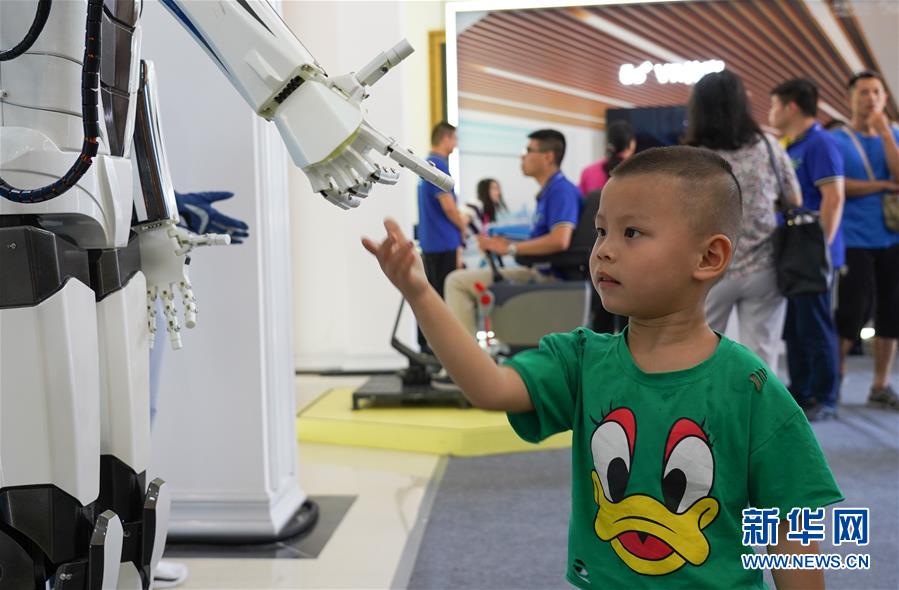 在江西鹰潭举行的2019江西国际移动物联网博览会上,一名小观众在和机器人“握手”(7月18日摄)。新华社记者 周密 摄