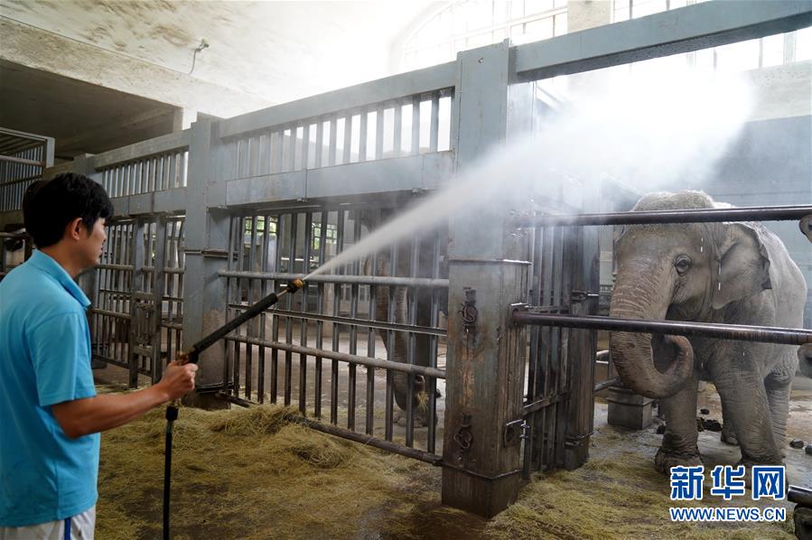 7月21日,上海动物园里的饲养员在给大象喷水降温。 当日,上海天气炎热,上海动物园采取多项措施防暑降温,让动物们乐享“清凉夏日”。 新华社记者 张建松 摄