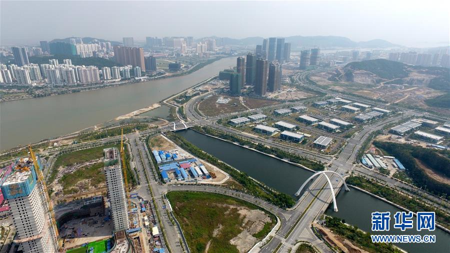 建设中的广东珠海横琴新区(左上方为澳门)(2017年11月4日摄)。 新华社记者卢汉欣摄